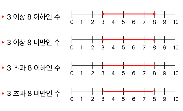 - 수직선에 표시할 때는 경계값이 포함되지 않으므로 안쪽이 비어있는 점 ○을 찍어 나타냅니다.